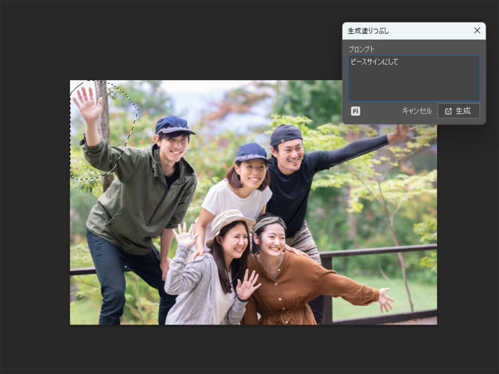 左側の男性の手を選択ツールで選択し、生成プロンプトに「ピースサインにして」と書き込みます。