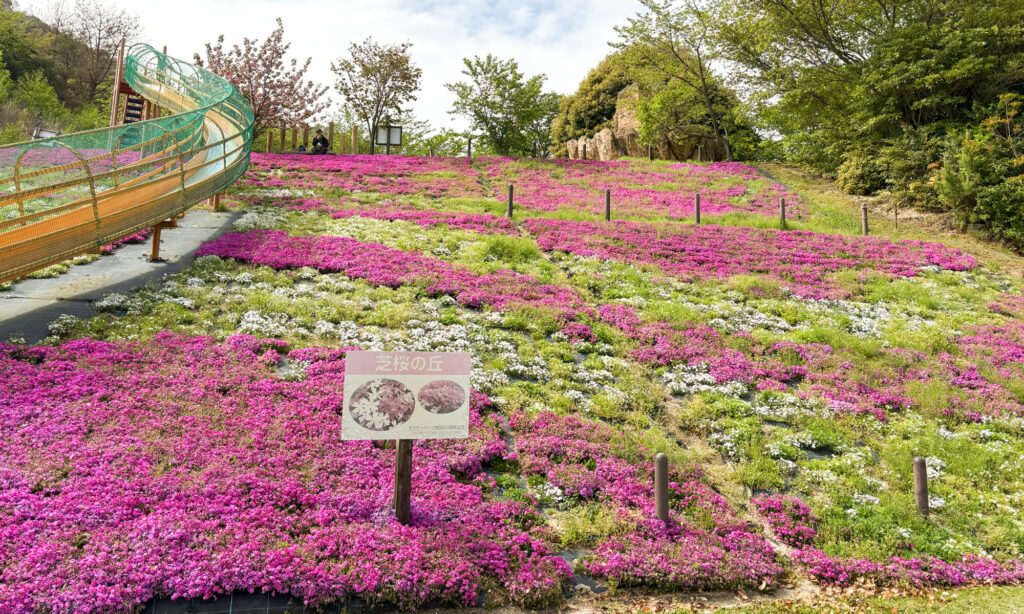 訪れた4月中旬頃は、約6000株の芝桜と八重桜がちょうど見頃。